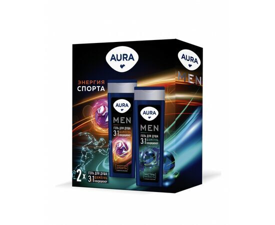 Aura Men Набор Энергия спорта гель для душа 3в1 250мл, гель для душа 3в1 экстра свежесть 250мл Подарочный набор для мужчин Aura Энергия
