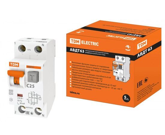 Название 1-2.Sale: TDM дифф. автоматический выкл. АВДТ 63 2P C25 30мА тип A, 6кА SQ0202-0004