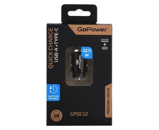 Название 1-2.Sale: Зарядное устройство автомобильное GoPower GPQC12, 1USB+1Type-C, 22,5Вт, Mini, черный