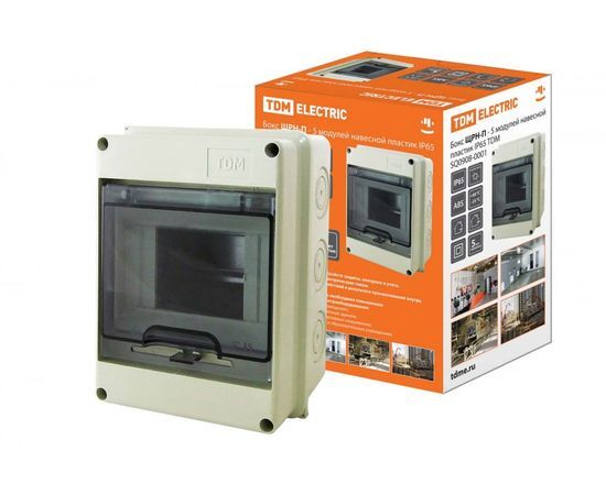 Название 1-2.Sale: TDM бокс (корпус) пластик ЩРН-Пг- 5 мод. наружный, опломбировка, серый IP65 SQ0908-0001