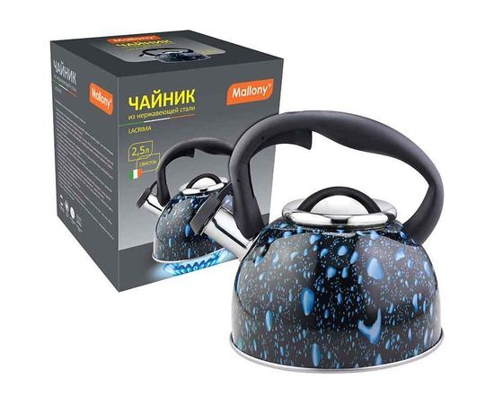 Чайник нерж.сталь со свистком Lacrima, 2,5л, окрашен (черный с синими каплями) 3979 Mallony