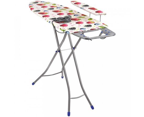 Гладильная доска с электросоединителем и подставкой под утюг, регулируемая по высоте. Удобная полка для белья и переносной подрукавник. Глади