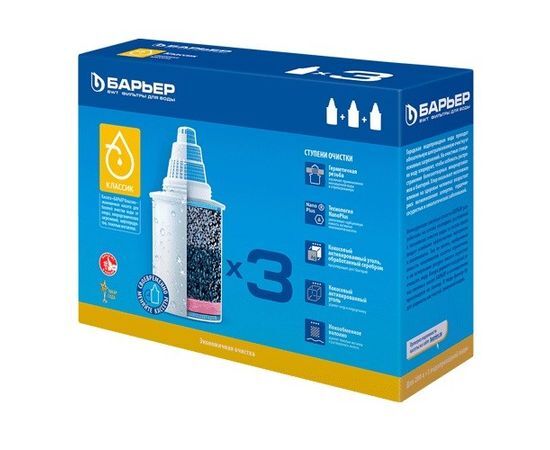 Комплект из 3 сменных кассет для фильтра БАРЬЕР Классик. Очищает воду от хлора, тяжелых металлов и других вредных примесей. Кассета БАР