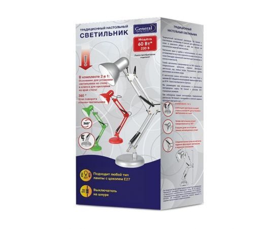 Название 1-2.Sale: General GTL-039 св-к настольный 60W E27 h600 металл/пластик серебр.,на основ+струбц 2в1 800139