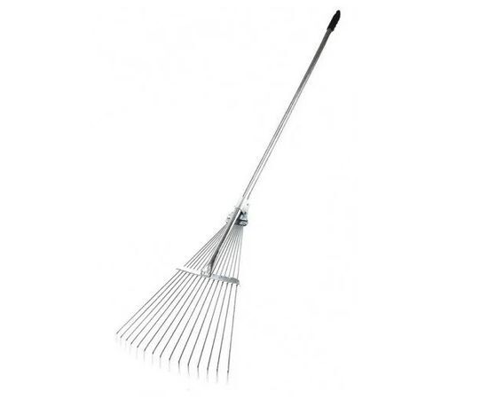 Регулируемые веерные грабли с черенком. Предназначены для очистки небольших участков, газонов от сухой травы или опавшей листвы.