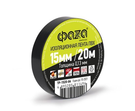Изолента ПВХ Фаза черная 15/20 TP-1520 арт. 5013483n - это электроизоляционная лента, которая используется для обмотки и изоляции проводов и кабелей. Она изготовлена из высококачественного ПВХ