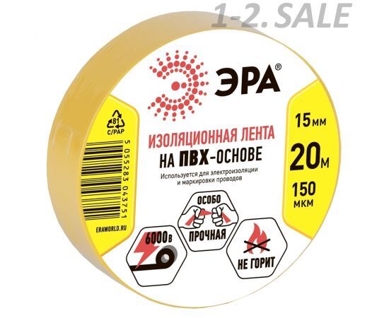 Название 1-2.Sale: ЭРА изолента ПВХ 15/20 желтая 0.15х15 мм, 20м 190% растяж. 3751