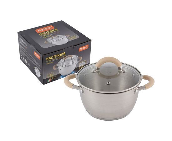 Кастрюля из нерж стали с крышкой, матовая,2,5 л, серия Fortuna, V-shape, ручки с сил-ном, тм Mallony