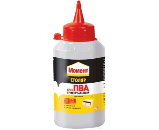 Водно-дисперсионный клей для склеивания всех пород дерева, ДСП, фанеры, шпона, ламината, картона, облицовочных материалов, фурнитуры, кожи, некоторых пластиков. Момент Столяр