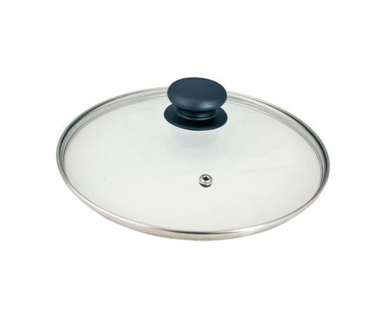Жаропрочная стеклянная крышка для сковороды и кастрюли HomeWay d 28 см, c удобной не нагревающейся ручкой, металлической каемкой и пароотводом. Металлический