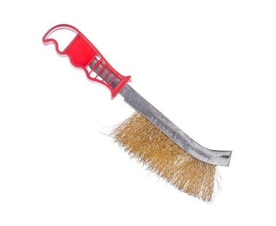 Металлическая щетка с пластиковой ручкой с проволокой оптимальной жесткости. За счет этого увеличивается легкость и качество очистки.