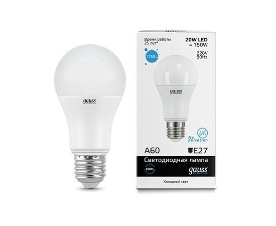 Название 1-2.Sale: Gauss Elementary лампа ЛОН A60 E27 20W(1750lm) 6500K 6K 120x60 матовая, пластик/алюм. 23239