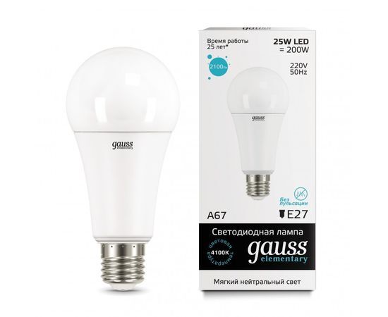 Название 1-2.Sale: Gauss Elementary лампа ЛОН A67 E27 25W(2100lm) 4000K 4K 143x67 матовая, пластик/алюм. 73225