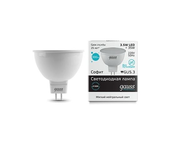 Название 1-2.Sale: Gauss Elementary лампа MR16 GU5.3 220V 3.5W(300lm) 4100K 4K 50x45 матовая пластик/алюм.13524