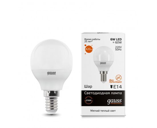 Название 1-2.Sale: Gauss Elementary лампа Шар G45 E14 6W(420lm) 3000K 2K 82x45 матовая, пластик/алюм. 53116