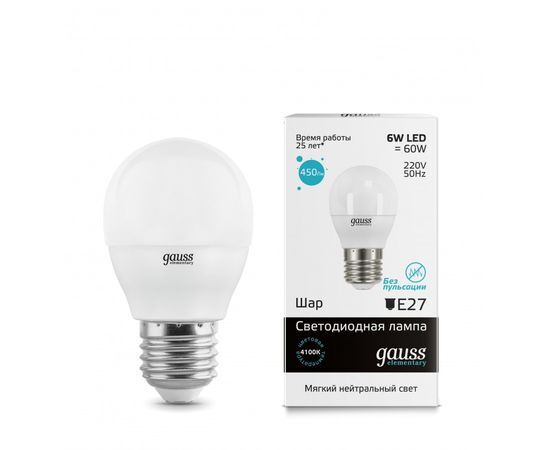 Название 1-2.Sale: Gauss Elementary лампа Шар G45 E27 6W(450lm) 4100K 4K 82x45 матовая, пластик/алюм. 53226