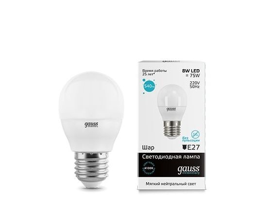 Название 1-2.Sale: Gauss Elementary лампа Шар G45 E27 8W(540lm) 4100K 4K 82x45 матовая, пластик/алюм. 53228