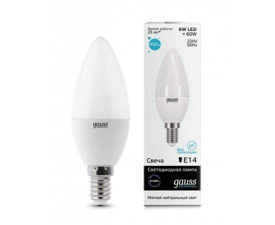 Название 1-2.Sale: Gauss Elementary лампа Свеча E14 6W(450lm) 4100K 4K 100x37 матовая, пластик/алюм. 33126