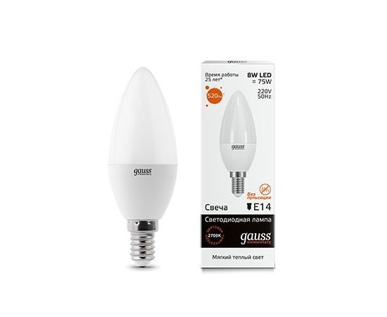 Название 1-2.Sale: Gauss Elementary лампа Свеча E14 8W(520lm) 3000K 2K 100x37 матовая, пластик/алюм. 33118