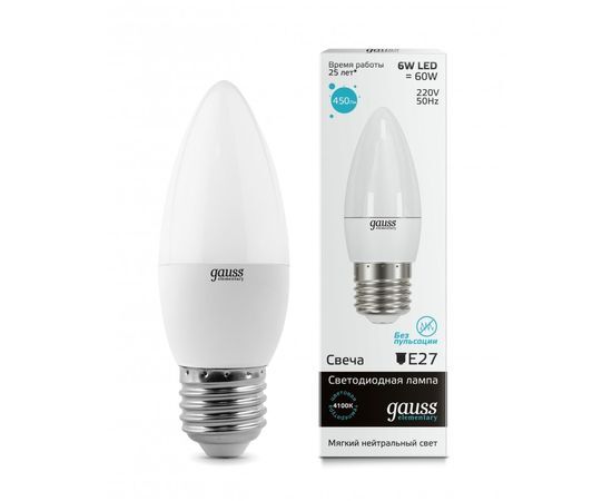 Название 1-2.Sale: Gauss Elementary лампа Свеча E27 6W(450lm) 4100K 4K 100x37 матовая, пластик/алюм. 33226