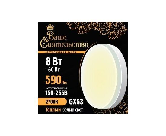 Название 1-2.Sale: ВАШЕ СИЯТЕЛЬСТВО лампа св/д GX53 8W(590lm) 2700K 2K 73x27 матов, пласт/алюм. IC-драйвер 2г cz866990