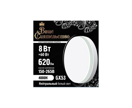 Название 1-2.Sale: ВАШЕ СИЯТЕЛЬСТВО лампа св/д GX53 8W(620lm) 4000K 4K 73x27 матов, пласт/алюм. IC-драйвер 2г cz866991