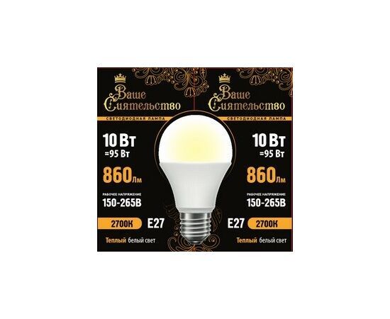 Название 1-2.Sale: ВАШЕ СИЯТЕЛЬСТВО лампа св/д ЛОН A60 E27 10W(860lm) 2700K 2K 108x60 матов, пласт/алюм. IC 2г cz866972