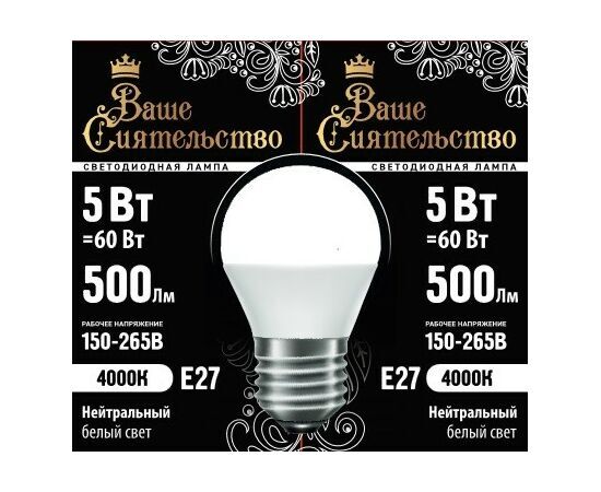 Название 1-2.Sale: ВАШЕ СИЯТЕЛЬСТВО лампа св/д шар G45 E27 5W(500lm) 4000K 4K 78x45 матов, пласт/алюм. IC 2г cz867015