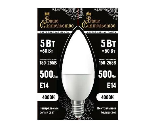 Название 1-2.Sale: ВАШЕ СИЯТЕЛЬСТВО лампа св/д свеча C37 E14 5W(500lm) 4000K 4K 100x37 матов, пласт/алюм IC 2г cz867000