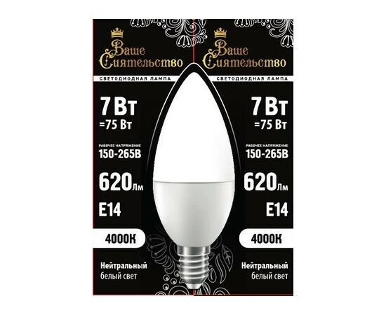 Название 1-2.Sale: ВАШЕ СИЯТЕЛЬСТВО лампа св/д свеча C37 E14 7W(620lm) 4000K 4K 110x37 матов, пласт/алюм IC 2г cz867006