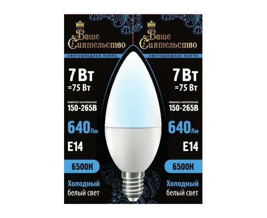 Название 1-2.Sale: ВАШЕ СИЯТЕЛЬСТВО лампа св/д свеча C37 E14 7W(640lm) 6500K 6K 110x37 матов, пласт/алюм IC 2г cz867007