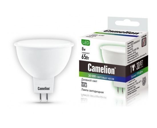 Лампочка светодиодная. Camelion MR16 GU5.3 220V 8W(600lm 100) 6500K 6K матов. 50x46 пластик LED8-S108/865/GU5.3, 1 шт.