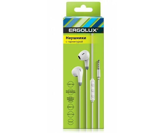 Название 1-2.Sale: ERGOLUX наушники вкладыши с гарнитурой Jack3.5, провод 1.2м, белый ERGOLUX ELX-WHP01-C01 коробка