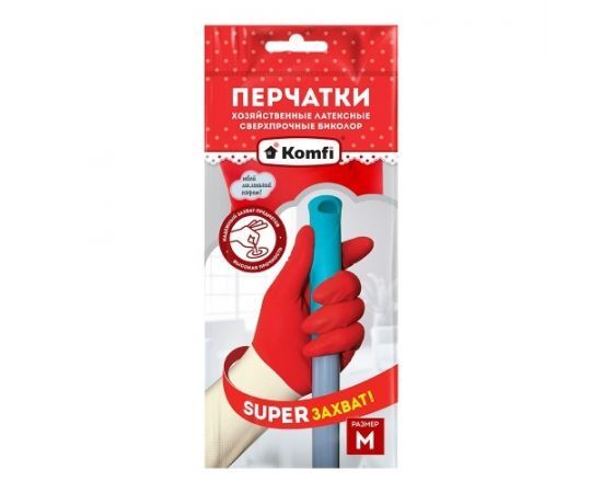 Название 1-2.Sale: Перчатки хозяйственные латекс 71гр пара,34см,без напыл,рельеф,разм М,БИКОЛОР СВЕРХПРОЧНЫЕ/Komfi