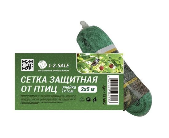 Название 1-2.Sale: 1-2.sale Сетка защитная от птиц 2*5м, яч.1,5х1,5см, полиэтилен, зеленая, E1M