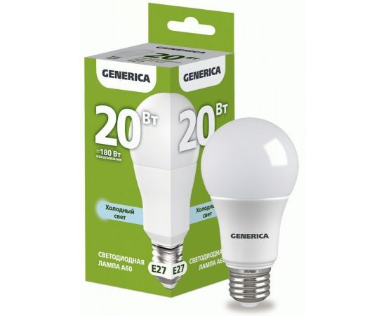 Название 1-2.Sale: GENERICA лампа св/д ЛОН A60 E27 20W(2000lm) 6500K 6K 60x125 матов. LL-A60-20-230-65-E27-G
